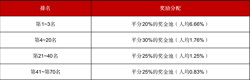 每月总奖池金额由每个月实际参赛用户数量决定,当月总奖池将平分到现货和合约中,并根据月排名,参赛用户按比例瓜分当月奖池,用户可同时参加现货和合约排名。